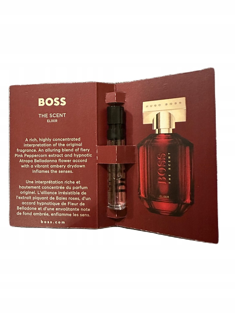 Ta ambrowo-drzewna kompozycja błyskawicznie zniewala, gdy otwiera się świeżym aromatem różowego pieprzu wraz z ognistymi fasetkami, które potęgują czar zapachu. W nucie serca prowokacyjne kwiatowe nuty pokrzyku wilczej jagody kuszą atmosferą tajemniczości i ekscytacji, roztaczając upajającą, przewrotną aurę. Nutę głębi tworzą bogate akordy ambrowe, które wyczarowują uczucie ożywienia, ciepła i zmysłowości po zmierzchu. Legendarny flakon BOSS The Scent wykonany jest z tego samego lakierowanego szkła w kolorze głębokiej czerwieni, co jego męski odpowiednik, odzwierciedlając uwodzicielską intensywność zapachu.